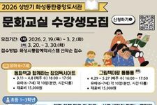 (시사미래신문) 화성특례시는 지난해 11월 3일 개관한 화성동탄중앙도서관에서 시민들이 다양한 독서·문화 활동을 즐길 수 있도록 2026년 상반기 문화교실 프로그램을 운영한다고 밝혔다. 이번 문화교실은 아동과 성인을 대상으로 총 10개 강좌로 구성됐으며, 연령별 특성과 관심사를 반영한 맞춤형 프로그램으로 운영될 예정이다. 아동 대상 강좌는 ▲동화책과 함께하는 창의독서아트(6~7세) ▲독서미술(초등1~3) ▲책과 함께 마음 한 걸음(초등1~3) ▲초등기자단: 신문으로 배우는 역사와 문화(초등4~6) ▲그림책이랑 통통통(6~7세) ▲서로 생각이 자라는 그림책(초등1~3) ▲디지털드로잉(초등4~6) 등이다. 성인 대상으로는 ▲내 목소리를 찾는 희곡 ▲그림에 머문 마음 한 조각 ▲이야기가 되는 내 일상 글쓰기 등으로 구성했다. 상반기 문화교실 1차 수강생 모집은 2월 19일, 2차 모집은 3월 20일부터 시작될 예정이다. 이와 함께 화성동탄중앙도서관은 시민 주도형 창작 활동을 지원하고, 시민 성장 중심의 독서문화 환경을 조성하기 위해 ‘메이크 북스(Make Books)’ 사업을 운영한다. ‘메이