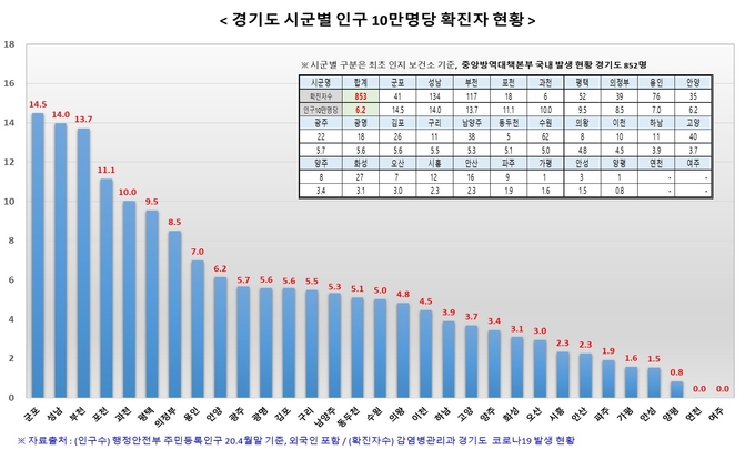 한편 1일 0시 기준 경기도 확진자수는 853명으로 전일 0시 대비 12명 증가했다.(전국 1만1,503명) 경기도 확진자 중 659명은 퇴원했고, 현재 175명이 병원 및 생활치료센터에서 격리중이다.