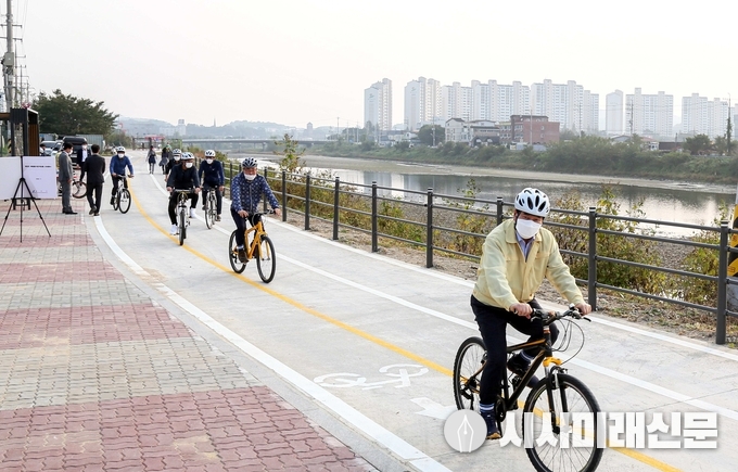 이날 백군기 용인시장은 최희학 처인구청장을 비롯한 시 간부공무원, 주민 등 30여명과 함께 현장을 찾아 개통 구간을 점검하고 직접 자전거를 타고 일부 구간을 주행했다.
