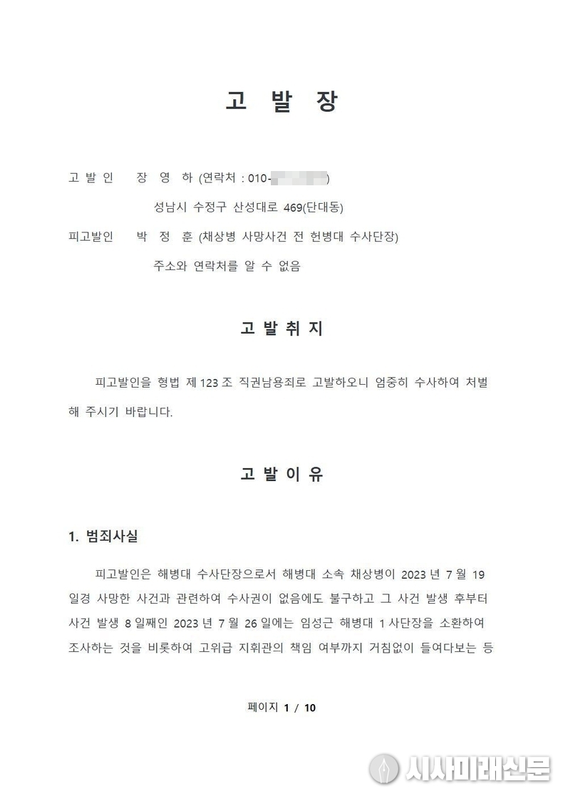 저는 2025년 8월 6일 오늘, 박정훈 해병대 수사단장을 형법 제123조 직권남용죄로 대검에 고발했습니다.