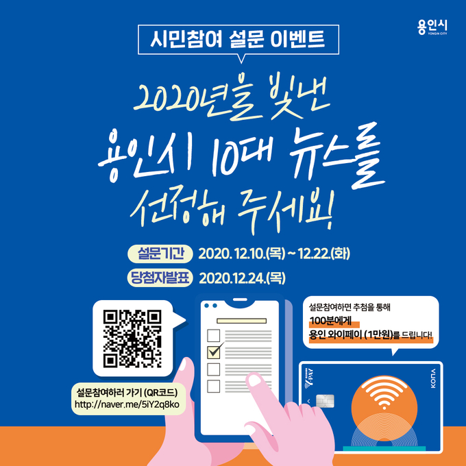 시는 오는 23일 설문조사 결과를 시 홈페이지와 SNS 등을 통해 발표할 계획이다. 참여한 시민을 대상으로 추첨해 100명에게 용인 와이페이도 지급한다.