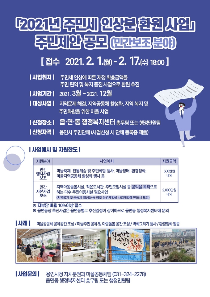 자세한 내용은 시 홈페이지(www. yongin.go.kr)에서 확인할 수 있고 문의는 시 자치분권과(031-324-2278)나 각 읍면동 총무팀 또는 행정민원팀으로 하면 된다.
