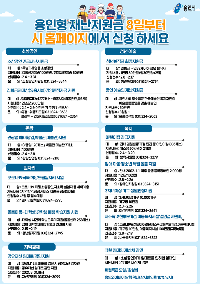 이와 관련 시는 대상자별 지원 내용과 금액, 신청방법 등을 한눈에 알아보기 쉽도록 일목요연하게 정리한 용인형 재난지원 통합 페이지를 구축했다고 덧붙였다.
