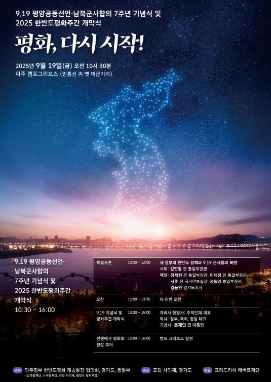 (시사미래신문) 경기도와 통일부, 민주정부 한반도평화 계승발전협의회가 공동으로 주최하고 프리드리히 애버트 재단이 후원하는 ‘9.19 평양공동선언 7주년 기념행사’가 오는 19일 오전 10시 30분 파주 캠프그리브스에서 열린다.