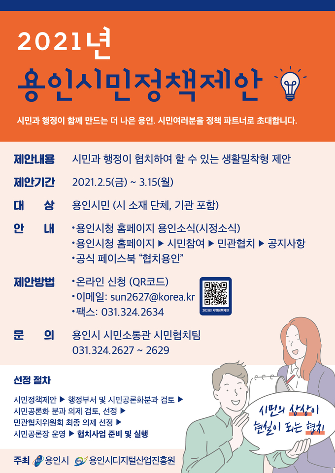 참여를 원하는 사람은 시청 홈페이지 시민참여코너> 민간협치> 공지사항의 ‘2021 용인시민 정책제안 접수 안내’를 참고해 이메일이나, 팩스, QR코드 등으로 접수하면 된다.