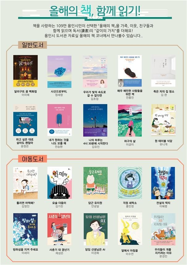 올해는 지난 1월 29일부터 지난달 18일까지 21일간 용인시 도서관 홈페이지와 중앙·기흥·수지 등 관내 13개 도서관에서 설문조사 방식으로 진행했으며 시민 10,643명이 참여했다. 시민들은 후보도서로 지정된 아동도서 20권과 일반도서 20권 중 각각 10권을 선별했다.