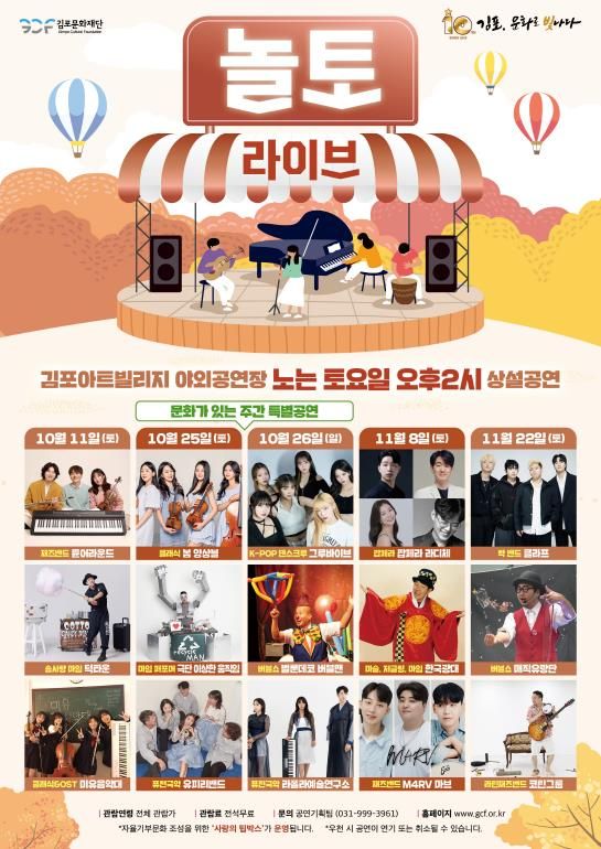 (시사미래신문) (재)김포문화재단은 10월 11일부터 11월 22일까지 매월 둘째, 넷째 주 토요일마다 김포아트빌리지 야외공연장에서 하반기 토요상설공연 '놀토 라이브'를 개최한다고 밝혔다.