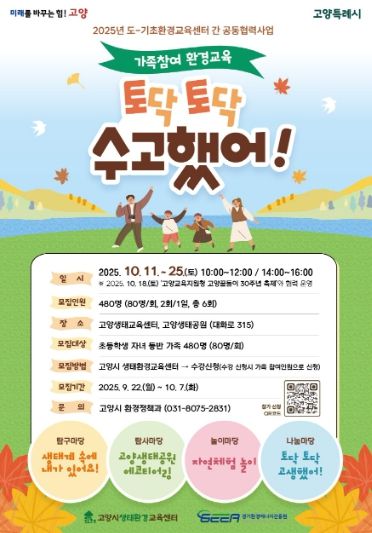 (시사미래신문) 고양특례시는 가족과 함께 참여하는 환경교육 프로그램‘토닥 토닥 수고했어!’를 오는 11일부터 25일까지 매주 토요일 고양생태교육센터와 고양생태공원에서 운영한다고 밝혔다.