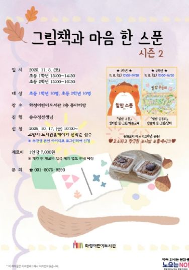 (시사미래신문) 고양특례시 화정어린이도서관은 오는 11월 8일 ‘고소하고 향긋한 보늬밤 보틀케이크’를 만들어보는 그림책 동화요리 프로그램‘그림책과 마음 한 스푼-시즌2’를 운영한다.