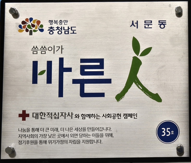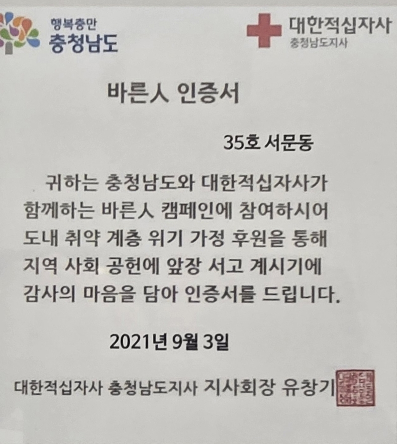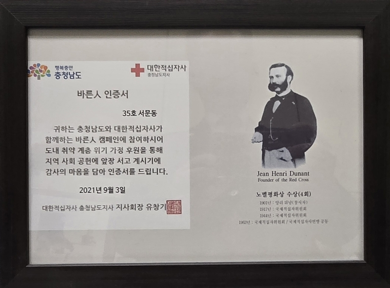 서문동처장은 2021년도 충청남도와 대한적십자사가 함께하는 도내 취약계층 위기 가정 후원으로 나눔을 실천하는 모금 활동에 적극 참여하며 “적십자 특별회원”으로 지역사회 공헌에 앞장서 나눔을 통해 더 큰 미래, 더 나은 세상을 만들어 나가며, 지역사회의 가장 낮은 곳에서 외면당하는 이들을 위해 정기후원을 통해 위기 가정의 자립을 지원하여 2021년 9월 1일 충청남도·대한적십자사 공동으로 “씀씀이가 바른인 35호”로 선정되어 “마음이 따뜻한 사람”으로 인정받은 바 있다.