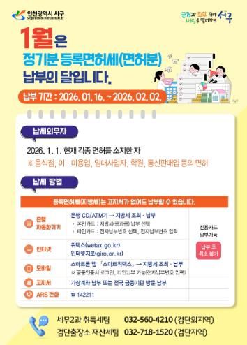 (시사미래신문) 인천 서구는 2026년도 1월 정기분 등록면허세 8만5천여 건, 28억9천4백만 원을 부과하고 올해 2월 2일까지 납부를 당부하는 등 적극적인 홍보에 나섰다.