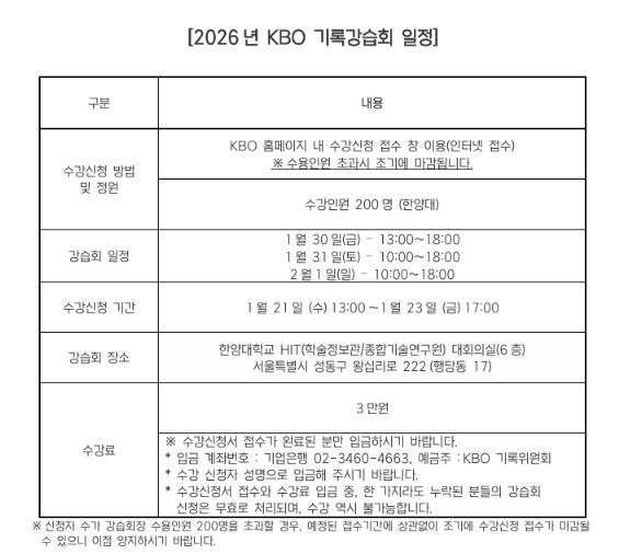 (시사미래신문) 2026년 KBO 기록강습회가 1월 30일(금)부터 2월 1일(일)까지 서울 한양대학교에서 개최된다. 기록강습회는 야구 공식기록법의 보급과 이해를 통한 저변 확대를 목적으로 프로야구 원년인 1982년부터 개최됐다.