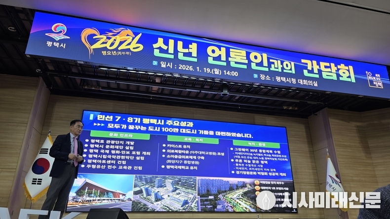 (시사미래신문) 평택시가 2026년 병오년을 맞아 1월 19일 신년 언론인 간담회를 열고 새해 시정 운영 방향과 주요 현안을 설명했다. 이날 간담회에는 100여 명의 언론인과 정장선 평택시장을 비롯한 간부 공무원들이 참석했으며, 간부 소개와 인사말에 이어 민선 7·8기 성과 보고, 2026년 주요 시책 설명, 질의응답 순으로 진행됐다.