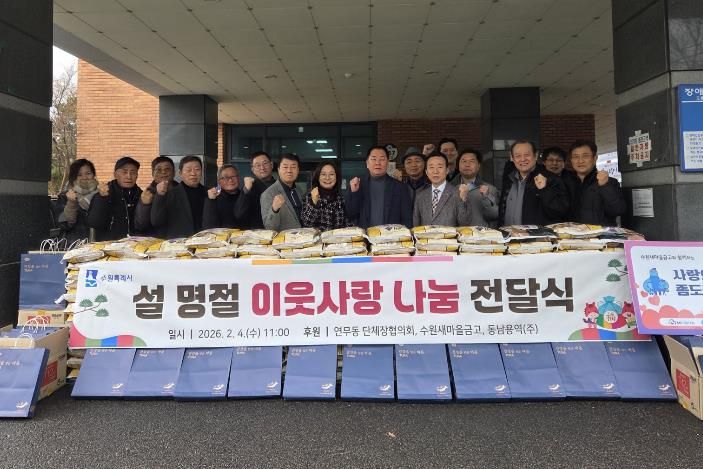 이번 전달식에서는 연무동 단체장협의회와 수원새마을금고의 따뜻한 후원으로 마련된 쌀 1,600kg가 기탁됐으며, 기탁된 후원 물품은 저소득 취약계층과 복지 사각지대가구에 전달될 예정이다.