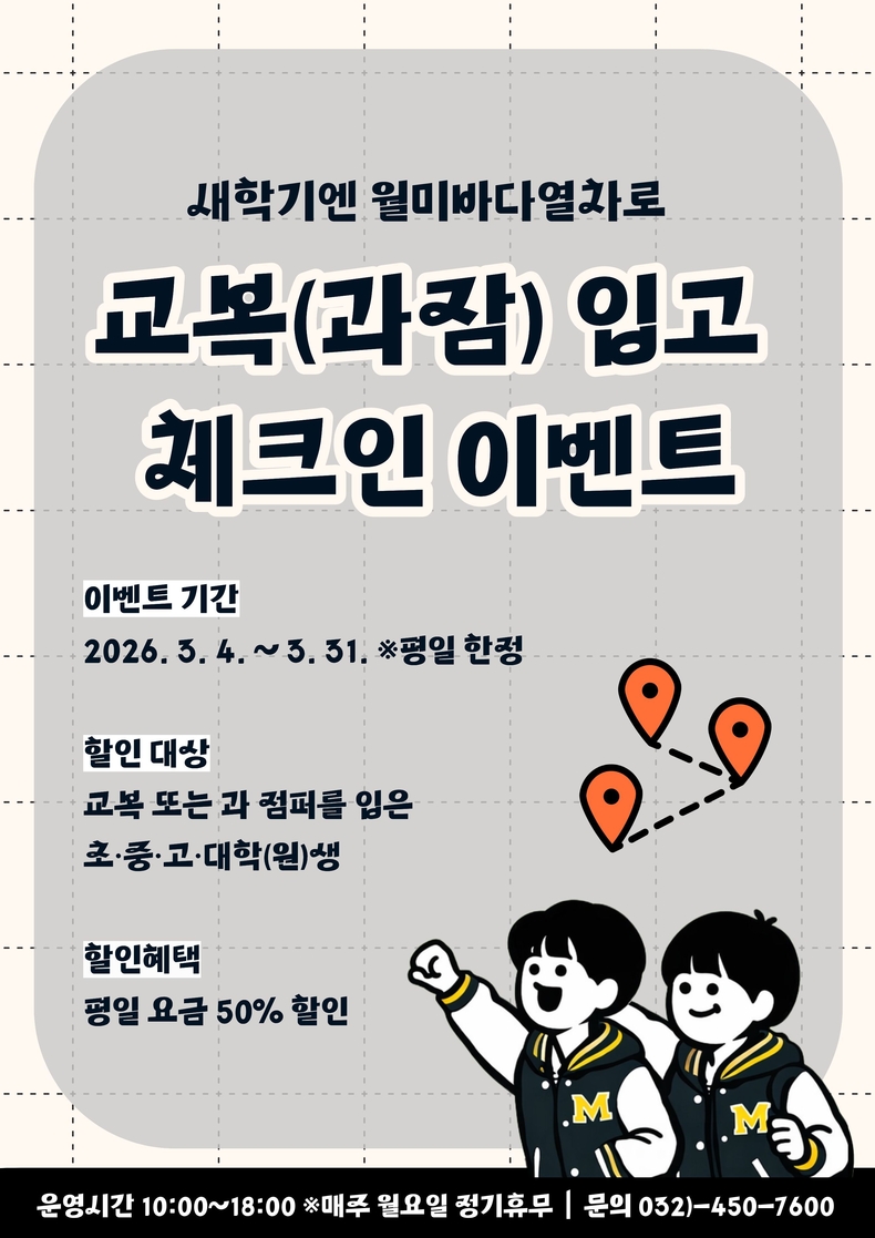 이벤트 기간 동안 교복 또는 학과 점퍼를 착용하고 월미바다열차를 이용할 경우 평일 이용요금의 50% 할인 혜택이 제공된다. 대상은 초·중·고등학생과 대학(원)생이며, 새학기 친구나 동기들과의 방문 수요에 맞춘 참여형 프로그램으로 시행될 예정이다.