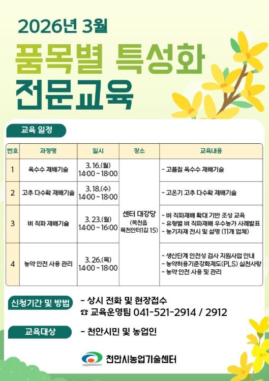 (시사미래신문) 천안시농업기술센터는 본격적인 영농철을 앞두고 ‘품목별 특성화 전문교육’을 운영한다고 6일 밝혔다.