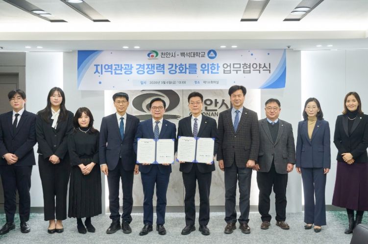 천안시는 6일 시청 제1소회의실에서 김석필 천안시장 권한대행 부시장과 송기신 백석대학교 총장 등 양 기관 관계자 9명이 참석한 가운데 ‘지역관광 경쟁력 강화를 위한 업무협약’을 체결했다고 밝혔다.