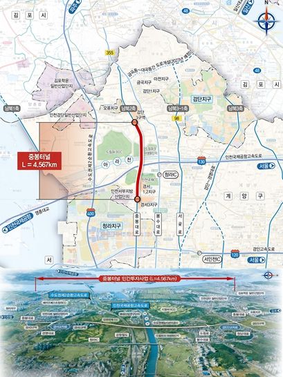 '중봉터널 민간투자사업'은 서구 경서동 경서삼거리에서 서구 왕길동 검단2교차로를 연결하는 총연장 4.567km, 왕복 4차로 규모의 지하터널을 건설하는 사업으로 우선협상대상자가 제안한 총사업비는 3,493억 원이며, 민간투자방식(BTO-a)으로 추진된다.