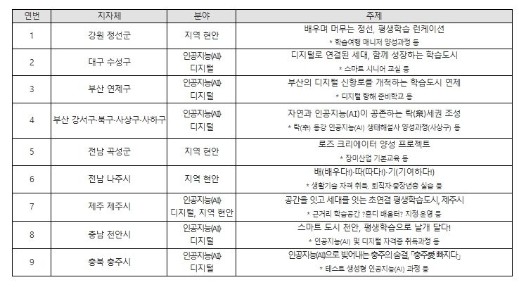 올해 교육부와 국가평생교육진흥원은 인공지능(AI) 대전환 시대 도래, 고령화·인구감소 등의 지역 현안 대응 등에 발맞춰, 기존 평생학습도시 201개(’25년 기준) 중 9개 평생학습도시를 지역의 색깔을 살린 ‘특성화 평생학습도시’로 거듭나도록 지원한다. 이번에 선정된 특성화 평생학습도시는 인공지능(AI)·디지털 학습, 지역 산업 참여, 세대 간 교류, 중장년 인재양성 등에 집중하여 평생교육을 지원할 계획이다.