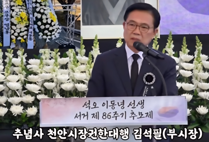 추념사에서 김석필 천안시장 권한대행은 ”이동녕선생님께서는 일제의 억압 속에서 개인의 안위가 아닌 민족의 대의를 삶의 중심에 두셨으며, 국내를 떠나 만주, 연해주, 중국 각지를 오가며 대한민국의 기틀을 세우고 분열과 위기의 순간마다 조직을 지켜낸 임시정부의 큰 어른이셨습니다“ 라고 말하며, ”오늘 우리가 누리는 자유와 대한민국의 번영은 인내와 헌신 위에 세워진 소중한 결실로 산에서 흐르는 작은 물줄기가 마침내 바위를 뚫는 것처럼 작은 뜻이 모여 이뤄질 수 있었던 결실이다”라고 강조했습니다.