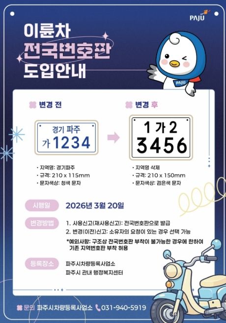 (시사미래신문) 파주시는 오는 20일부터 이륜차 전국번호판 제도를 본격 시행한다.