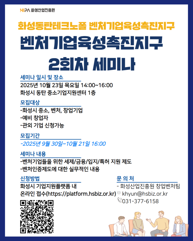 (시사미래신문) 화성산업진흥원(원장 전병선)이 오는 10월 23일 화성시 중소기업지원센터에서 ‘2025년 벤처기업육성촉진지구 2회차 세미나’를 개최한다.