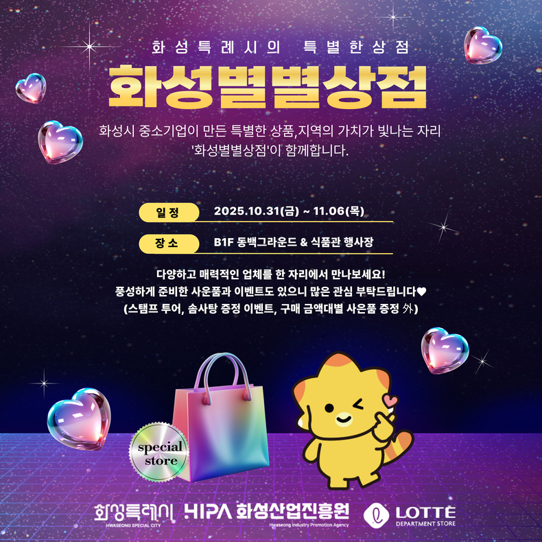(시사미래신문) 화성산업진흥원(원장 전병선)은 ‘2025 오프라인 판매기획전–화성별별상점’을 오는 10월 31일부터 11월 6일까지 롯데백화점 동탄점 지하 1층 동백그라운드 행사장에서 개최한다고 밝혔다.