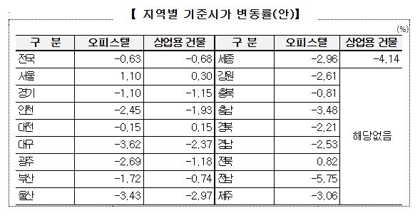 기준시가(안)에 따르면, 오피스텔은 전년 대비 0.6 % 하락, 상업용 건물은 전년 대비 0.7 % 하락한 것으로 확인된다. 다만, 서울 지역의 오피스텔과 상업용 건물 기준시가는 공히 각각 1.1 %, 0.3 % 상승한 것으로 나타난다.