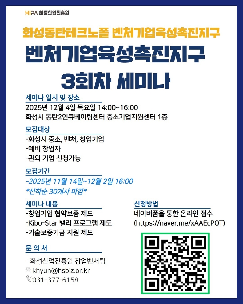 (시사미래신문) 화성산업진흥원(원장 전병선)은 오는 12월 4일, 화성시 중소기업지원센터에서‘2025년 벤처기업육성촉진지구 3회차 세미나’를 개최한다.