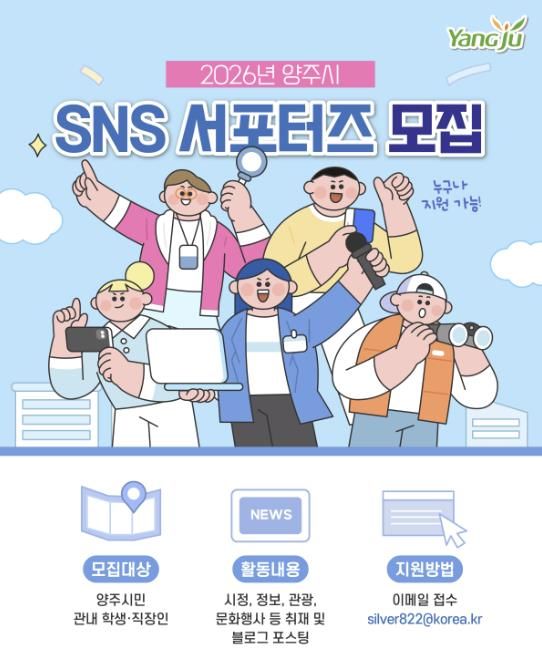 (시사미래신문) 양주시가 시민과 소통하며 시정 소식과 지역의 숨은 매력을 널리 알릴 '2026년 양주시 SNS 서포터즈'를 오는 12월 1일부터 10일까지 10일간 모집한다.