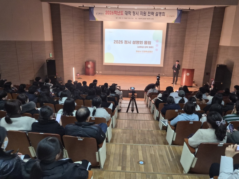 (시사미래신문) 화성시인재육성재단(대표이사 임선일) 교육협력지원본부는 지난 12월 15일 수원대학교 벨칸토 아트센터 소극장에서 수험생과 학부모를 대상으로 한‘2026학년도 대학 정시 지원 전략 설명회’를 개최했다.