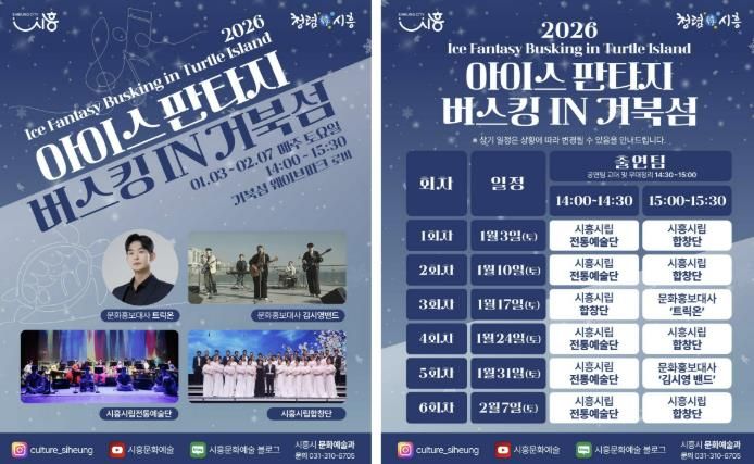 (시사미래신문) 시흥시는 지난 연말에 진행된 ‘2025 시흥 사운드 오브 윈터’의 열기를 잇는 후속 문화예술 프로그램으로, 겨울철 거북섬을 찾는 시민과 관광객에게 풍성한 즐길 거리를 제공하고자 ‘2026 아이스 판타지 버스킹 인 거북섬’을 운영한다.
