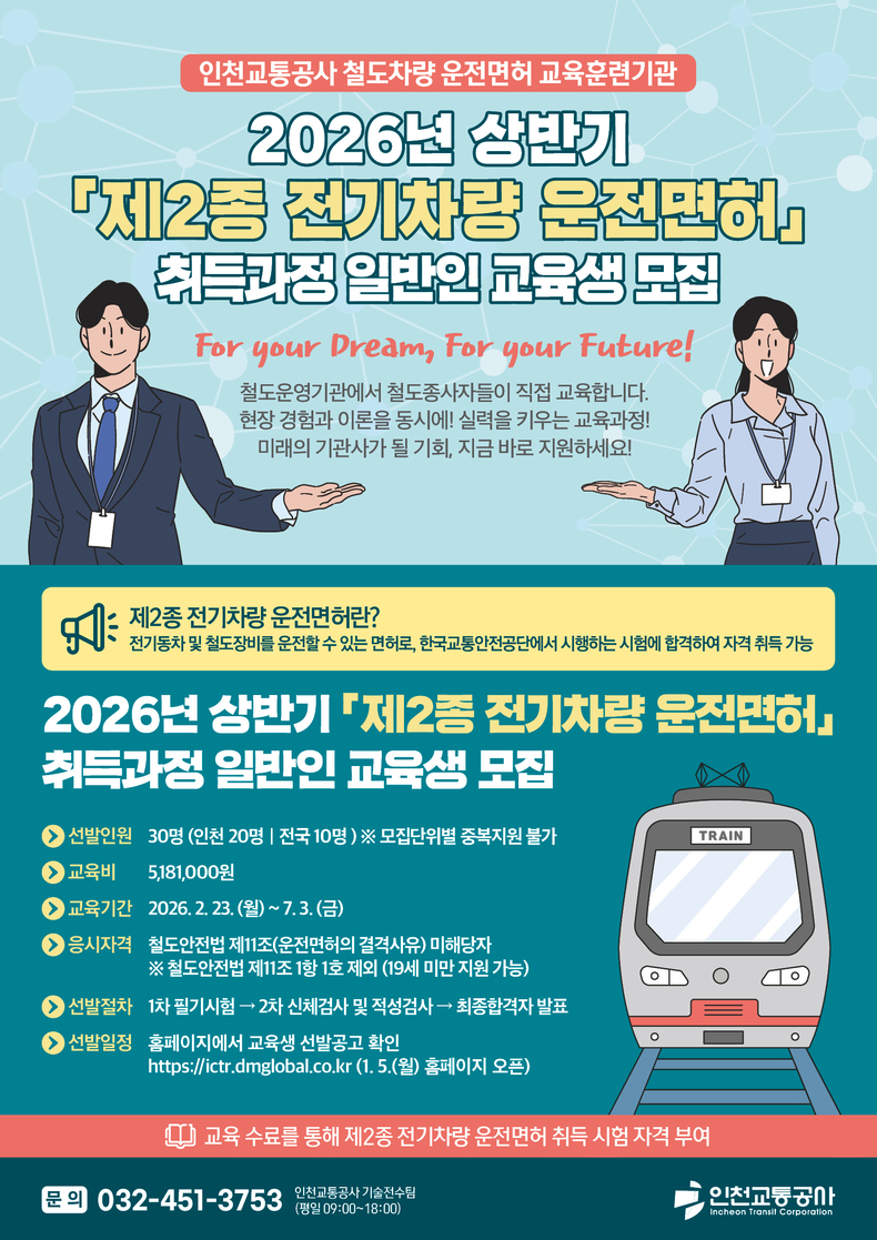(시사미래신문) 인천교통공사(사장 최정규)는 2026년 상반기 ‘제2종 전기차량 운전면허’ 취득과정 일반인 교육생을 모집한다고 5일 밝혔다.