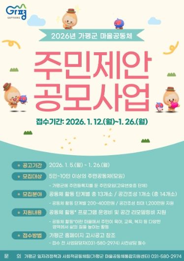 (시사미래신문) 가평군이 주민 주도의 마을공동체 활성화를 위해 ‘2026년 가평군 마을공동체 주민제안 공모사업’을 추진한다.