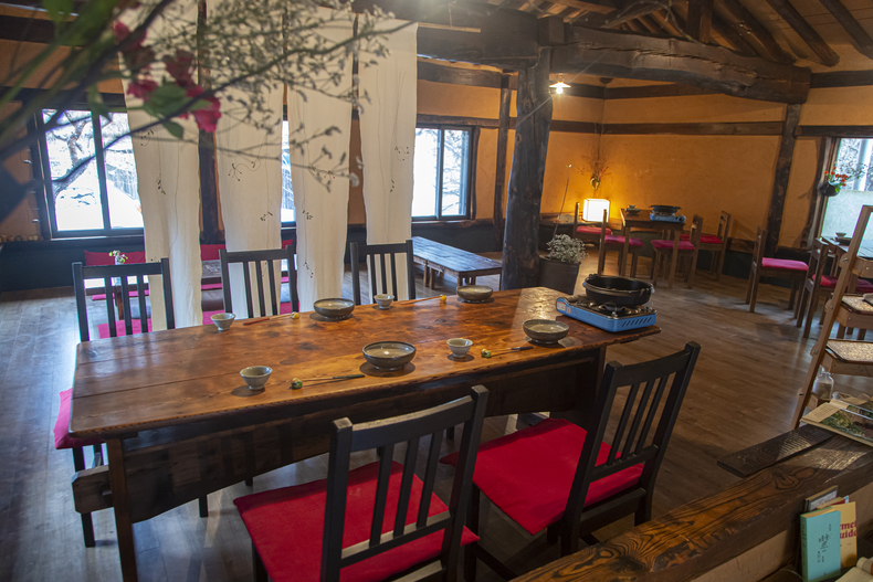 북한강을 끼고 하류 방향으로 달리다가 문호리에서 푯대봉 방향으로 좌회전하면 좁은 마을길이 이어진다. 언덕길을 500여 미터 오르면 한옥 건물 하나를 만나는데, 마치 영화 세트장을 연상케 할 정도로 고즈넉하다. 일식 스키야끼를 전문으로 하는 ‘사각하늘’이다. 간판이 없어 사전 정보가 없다면 지나치기 쉽지만 그만큼 일부러 숨겨둔 듯한 분위기를 간직하고 있다. 놀랍게도 이 한옥을 지은 사람은 일본인 건축가다. 주인내외 중 일본인 남편은 한옥의 매력에 빠져서 이곳을 지었고 한국인 아내는 다도와 일본식 코스 요리인 가이세키를 오래도록 공부해왔다. 두 사람의 취향을 녹여 사각하늘이라는 공간이 1998년 만들어졌다.