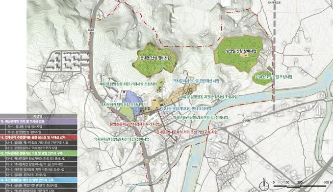 이를 구체화하여 △읍내동산성 및 성안말산성의 수목정비와 탐방로 정비 △읍내동 지역 거리 조성 기반구축 △역사정원 가꾸기 및 역사놀이터 조성 △역사문화권 방문자 센터 및 복합커뮤니센터 조성 △게스트 하우스와 마을도서관 조성 △보행환경 개선 △다양한 역사문화권 교육프로그램 운영 등으로 실행계획을 수립했다.