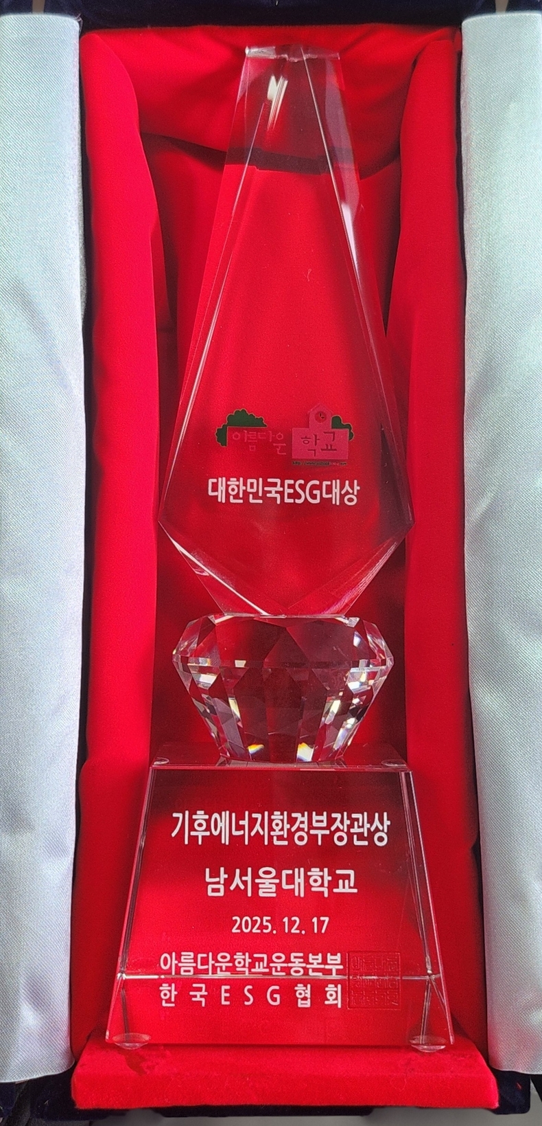 남서울대학교는 지난해 12월 17일 남서울대 지식정보관 사랑홀에서 열린 아름다운학교운동본부와 한국ESG협회에서 주최하는 '제4회 대한민국 ESG대상” 시상식에서 ”기후에너지환경부장관상“을 수상했다고 밝혔다.