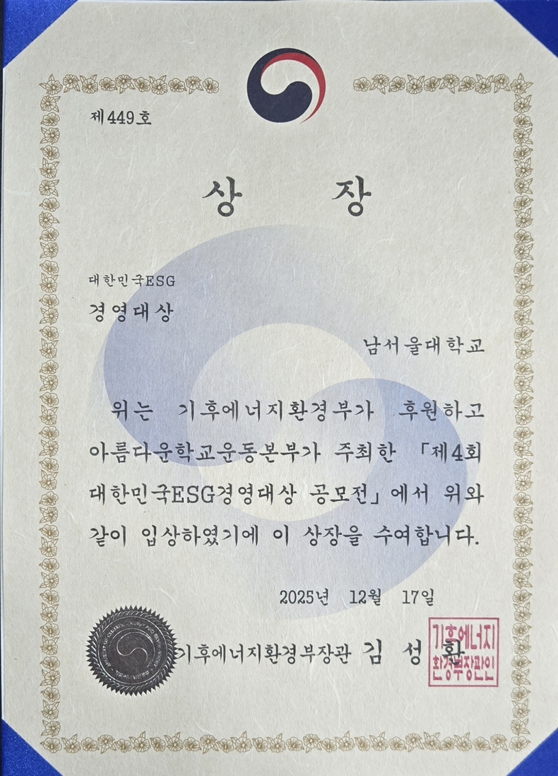 대한민국 ESG대상 시상식은 2022년도부터 ESG경영 실천의 환경(Environment) · 사회(Social) · 지배구조(Governance)를 핵심가치로 하는 ESG경영을 실천하는 우수 교육기관과 단체를 발굴 · 격려하기 위해 마련되었으며, 남서울대학교는 제4회 대한민국 ESG경영대상의 기후에너지환경부장관상을 수상하였다.