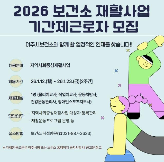 (시사미래신문) 여주시보건소는 지역 내 등록장애인과 예비장애인들의 건강관리를 위한 지역사회중심재활사업 추진을 위해 1월 12일부터 1월 23일까지 2주간 기간제근로자 채용 공고를 실시한다.