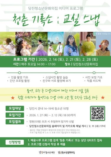 (시사미래신문) (재)당진시청소년재단 당진청소년문화의집(관장 유수민)은 오는 2월 14일부터 28일까지 매주 토요일, 14시부터 17시까지 관내 14~19세 청소년을 대상으로 미디어 프로그램 [청춘 기록소 : 교실 스냅]을 운영할 예정이다.