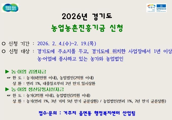 (시사미래신문) 이천시는 농업인에게 장기·저리 융자 지원을 실시하고 경영안정을 돕기 위해 2026년 경기도 농업농촌진흥기금 농어업 경영자금, 농어업 생산유통시설자금 사업에 대한 신청을 2월 3일부터 접수한다.