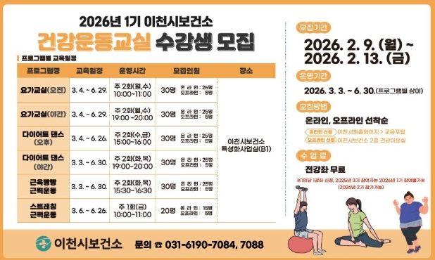 (시사미래신문) 이천시보건소는 시민들이 건강생활을 실천할 수 있도록 ‘2026년 건강운동교실 1기’ 참여자를 선착순으로 모집한다.