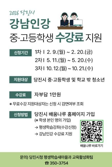 (시사미래신문) 당진시는 사교육비로 인한 부모들의 경제적 부담 덜기 위해 당진시 중고등학생과 학교 밖 청소년을 대상으로 ‘강남인강’ 수강료를 지원한다고 6일 밝혔다.