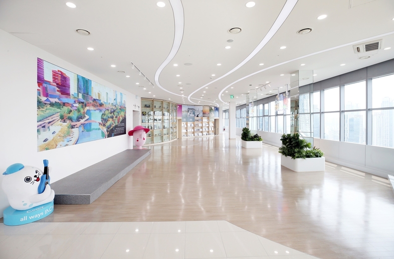 송도지타워 33층 위치한 홍보관은 전면이 유리로 둘러싸여 송도국제업무지구와 센트럴파크, 워터프런트 등 송도의 전경을 파노라마처럼 한눈에 감상할 수 있다.