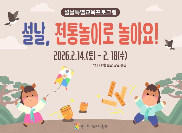 (시사미래신문) 경기문화재단 경기도어린이박물관은 설날을 맞이하여 2026년 2월 14일부터 2월 18일까지 설날 특별프로그램 '설날, 전통놀이로 놀아요!'를 운영한다. 설 연휴 동안 박물관을 방문하는 어린이와 동반 가족을 위해 가족 간의 유대감을 높일 수 있는 전통문화 체험프로그램 3종을 준비했다.