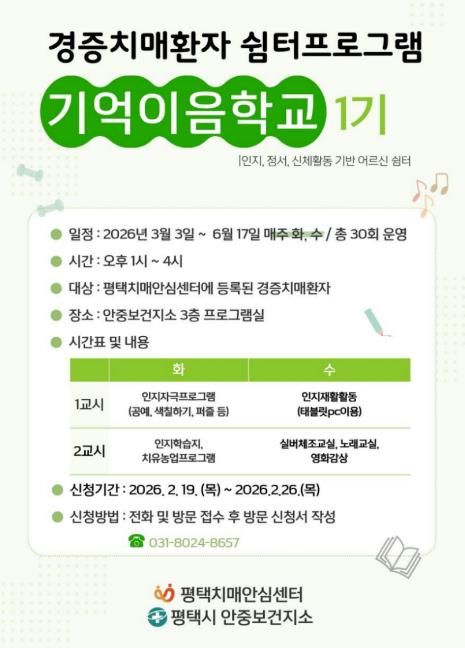 (시사미래신문) 평택시 안중보건지소는 경증 치매 환자의 인지기능 유지와 일상생활 지원을 위해 오는 3월 3일부터 6월 17일까지 경증 치매 환자 쉼터 프로그램 ‘기억이음학교 1기’를 운영한다.