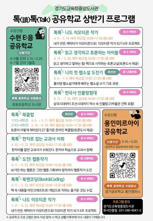 (시사미래신문) 경기도교육청중앙도서관이 학생들의 창의적 사고력과 진로설계 역량을 강화하기 위해 4월부터 7월까지 녪년 상반기 톡(讀)톡(talk) 공유학교’를 운영한다.