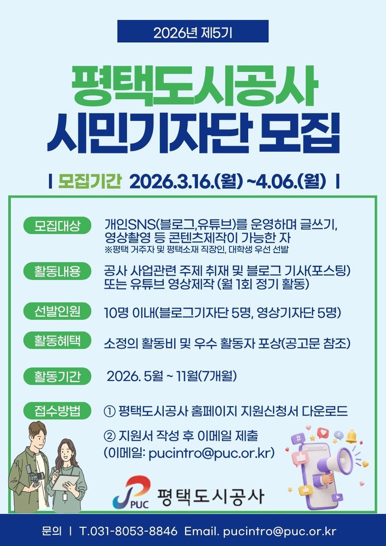 (시사미래신문) 평택도시공사(사장 한병수)는 시민과 함께하는 열린 소통을 통해 공사의 다양한 사업과 시설을 알리고, 공공서비스를 더욱 발전시키기 위해 ‘시민기자단(5기)’를 모집한다고 밝혔다. 모집 기간은 3월 16일(월)부터 4월 06일(월)까지다.