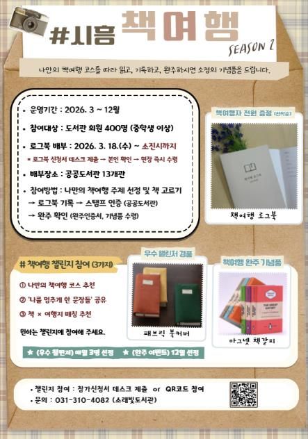 (시사미래신문) 시흥시도서관은 시민의 독서 실천을 지원하고 일상 속 독서문화를 확산하기 위해 3월 18일부터 ‘2026 시흥 책여행(시즌2)’ 로그북을 배부하고, ‘책여행 로그북 챌린지’를 함께 운영한다.