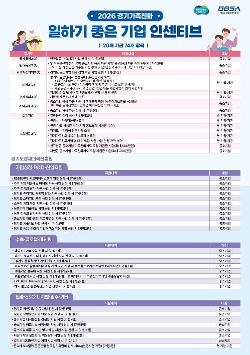 이 밖에도 수출기업 물류비 지원, 중소기업육성자금 등 다양한 기업 지원 사업 신청 시 가점을 부여하는 등 74종의 혜택이 제공된다. 특히 올해는 ‘4.5일제 지원 사업’과 주 20시간(0.5잡), 주 30시간(0.75잡) 형태의 단축근무를 지원하는 ‘경기가족친화기업 0.5&0.75잡 지원 사업’ 참여 기업에도 가점을 부여해 일‧생활 균형 정책을 적극 실천하는 기업을 우대할 계획이다.